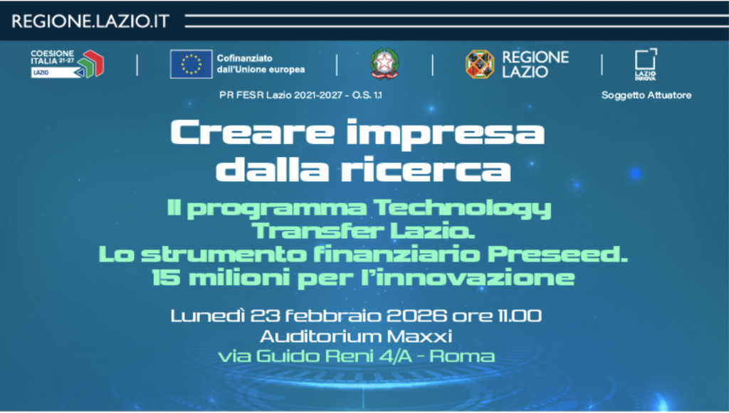 Lunedì 23 febbraio 2026, alle ore 11.30, presso l’Auditorium del MAXXI – Museo nazionale delle arti del XXI secolo (Via Guido Reni 4/A, Roma), si terrà l’evento “Creare impresa dalla ricerca”, dedicato al Programma Technology Transfer Lazio e allo strumento finanziario Preseed.